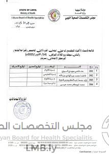 قائمة بأسماء الاطباء المتقدمين لدخول امتحان الجزء الاول لتخصص الجراحة العامة (مصراتة) 10 أكتوبر، 2025