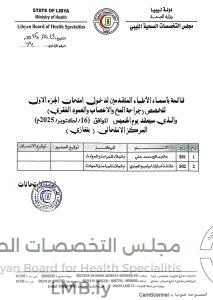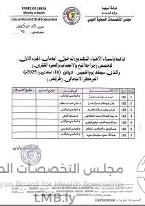 قائمة بأسماء الاطباء المتقدمين لدخول امتحان الجزء الاول لتخصص الجراحة العامة (مصراتة) 10 أكتوبر، 2025