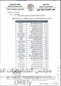 قائمة بأسماء الاطباء المتقدمين لدخول امتحان الجزء الثاني كتابي لتخصص جراحة العظام (بنغازي) 20 أكتوبر، 2025