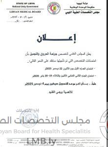 اعلان عن تأجيل الامتحانات لتخصص جراحة الحروق والتجميلمشرف الموقع20 أكتوبر، 2025مواعيد الإمتحانات Oplus_0 المقالة السابقة قائمة بأسماء الاطباء المتقدمين لدخول امتحان الجزء الثاني كتابي لتخصص جراحة العظام (بنغازي)