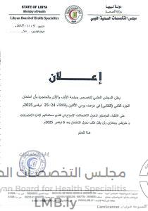 قائمة بأسماء الاطباء المتقدمين لدخول امتحان الجزء الثاني كتابي لتخصص جراحة الانف والاذن والحنجرة(طرابلس-بنغازي) 19 نوفمبر، 2025