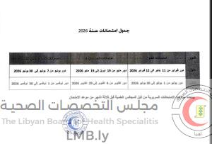 جدول الامتحانات لسنة 2026مشرف الموقع10 ديسمبر، 2025مواعيد الإمتحانات Oplus_131072 المقالة السابقة قائمة بأسماء الاطباء المتقدمين لدخول امتحان السريري لتخصص جراحة الأوعية الدموية