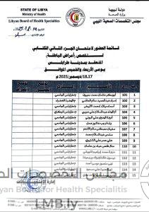 قائمة بأسماء الاطباء المتقدمين لدخول امتحان الجزء الاول لتخصص امراض الباطنة (بنغازي – سرت – درنة) 14 ديسمبر، 2025