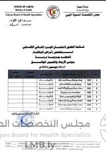 قائمة بأسماء الاطباء المتقدمين لدخول امتحان الجزء الاول لتخصص جراحة الحروق والتجميل (طرابلس – بنغازي) 19 ديسمبر، 2025