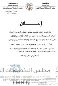 قائمة بأسماء الاطباء المتقدمين لدخول امتحان الجزء الاول لتخصص امراض الباطنة (بنغازي – سرت – درنة) 14 ديسمبر، 2025
